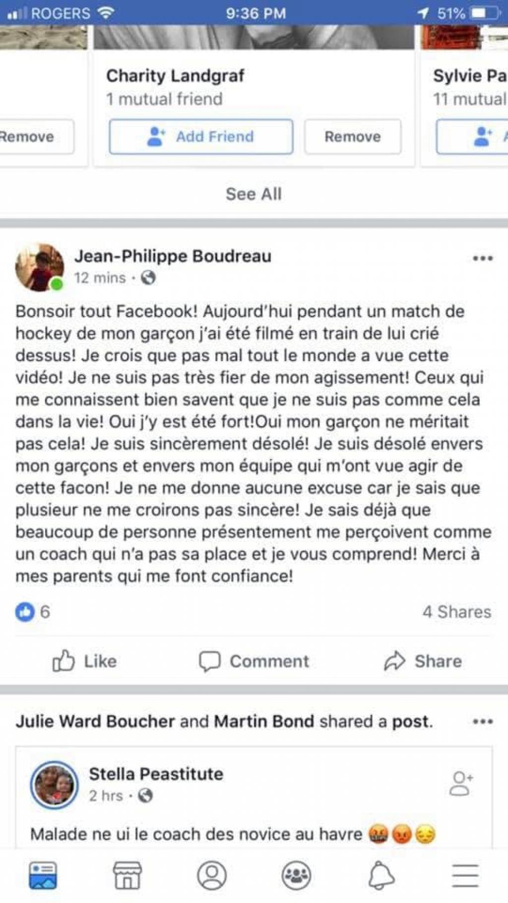 Good evening all of Facebook. Today during my son's hockey game I was filmed screaming at him. I believe that by now just about everyone has seen the video. I am not very proud of my behavior. Those who know me know that this is out of character for me. Yes I did over react. Yes, it's true that my son did not deserve it. I am sincerely sorry. I am apologize to my son and to the entire team who saw me behave in this manner. I do not want to make any excuses for myself because I know people will not think I am sincere if I do. I know that already many of you feel that I am a coach who has no business behind the bench and I completely understand. Thank you to the parents who still have confidence in me.