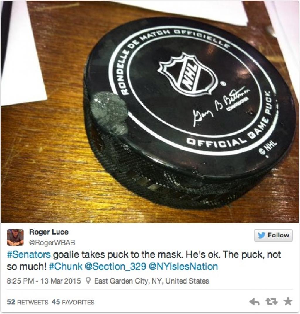 Ottawa Senators goaltender Andrew Hammond is thanking his lucky stars that helmets are made solid. New York Islanders defenseman Johnny Boychuk one-timed a shot that struck Ottawa Senators goaltender Andrew Hammond in the mask in the second period of