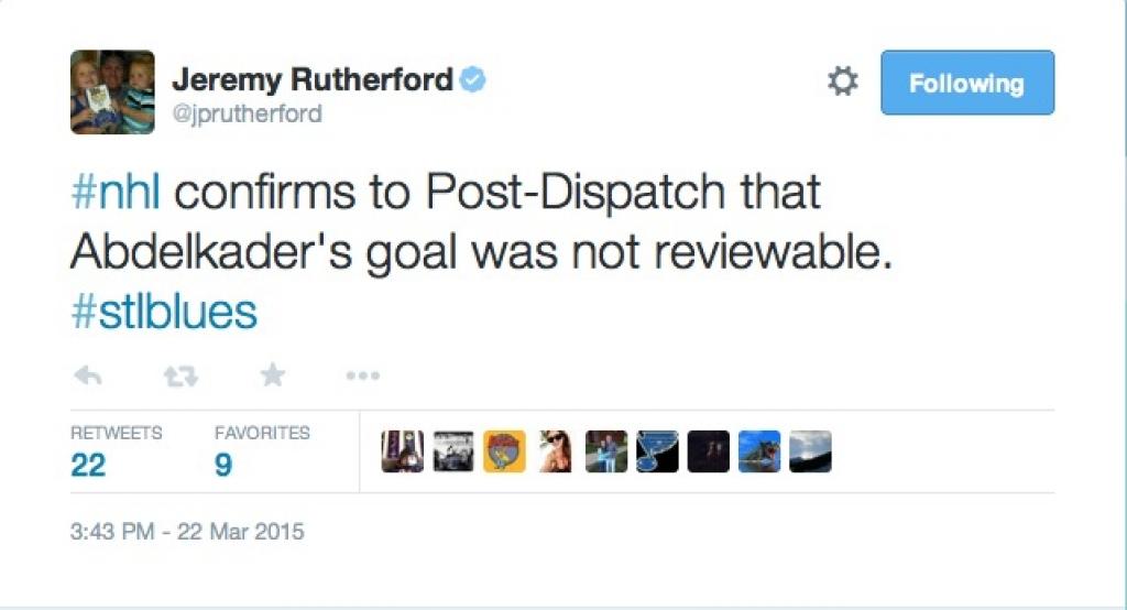 Red Wings forward Justin Abdelkader scored the game-winning power-play goal 24 seconds into the overtime period of Sunday's game against St. Louis, but appeared to tap a rebound past Jake Allen with the aid of a broken stick.