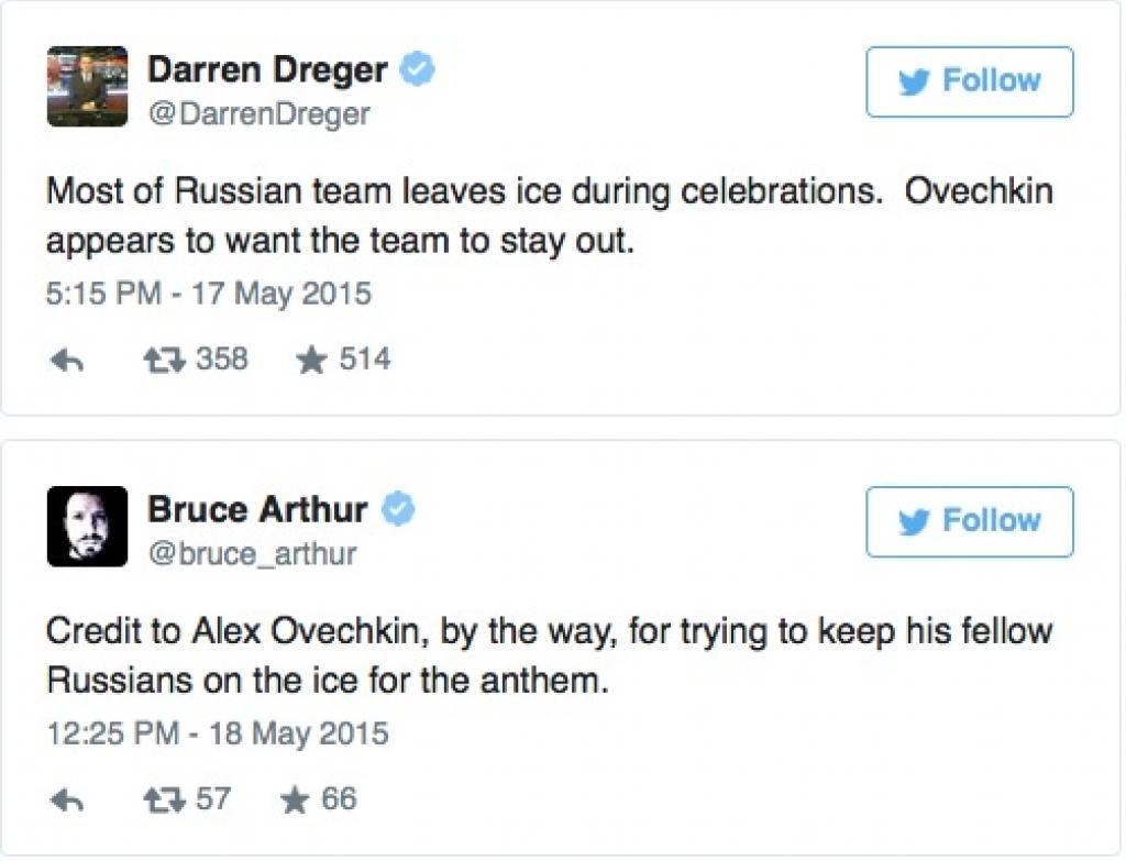 To their credit, eight Russian players remained on the ice to show their grace in defeat. Of those eight were Alexander Ovechkin and Evgeni Malkin. Ovechkin even attempted to convince some of the players not to leave, to no avail.