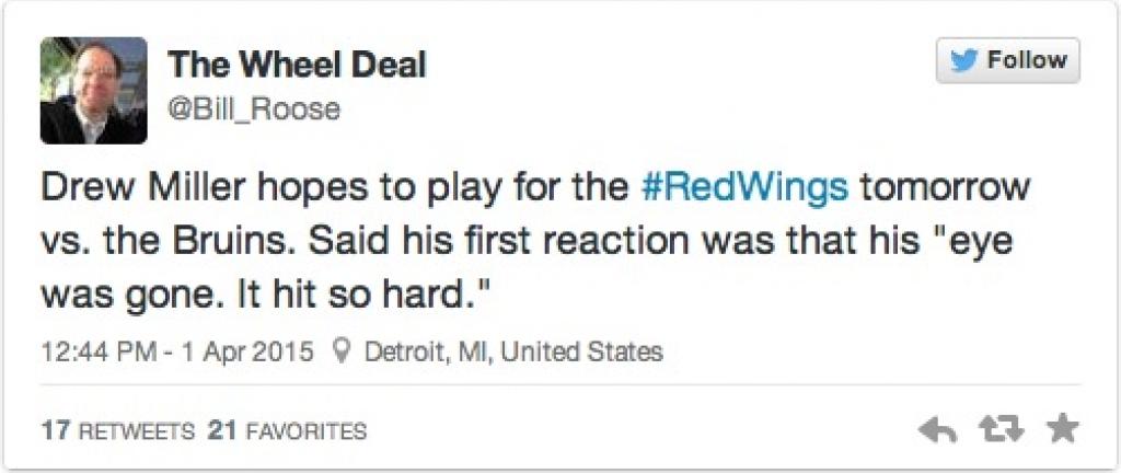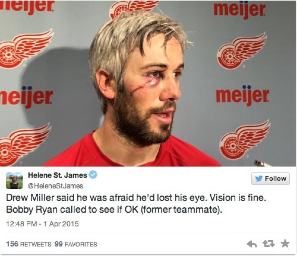Detroit Red Wings forward Drew Miller was an unfortunate example of what can happen in a game where grown men skate around with knives on their feet. Miller had his face sliced open off the faceoff last night against the Ottawa Senators, nearly losin